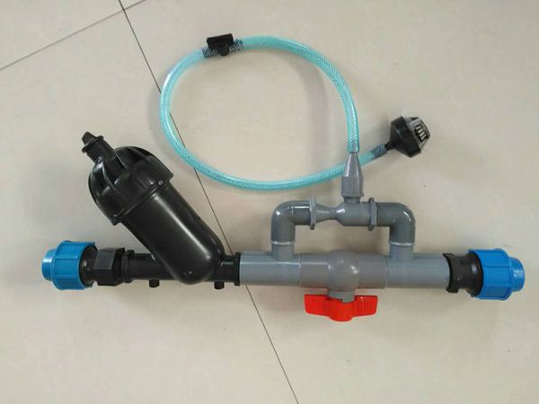 文丘里施肥器與微灌系統或灌區入口處的供水管控制閥門并聯安裝,使用時將控制閥門關小,造成控制閥門前后有一定的壓差,使水流利經過安裝文丘里施肥器的支管,用水流通過文丘里管產生的真空吸力,將肥料溶液從敞口的肥料桶中均勻吸入管道系統進行施肥。