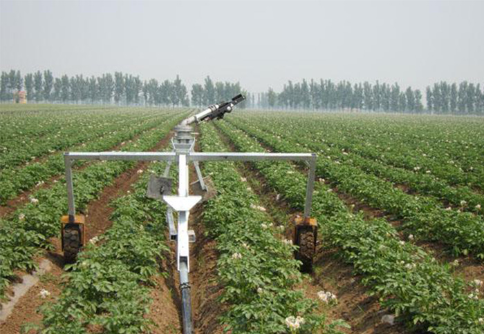 噴頭車是一個具有兩個行走輪并安裝噴頭的機構,通過PE管牽引此機構進行噴灑作業。每次灌溉終了噴頭車能自動的被舉升到運輸位置,并且傳動系統經連桿的作用而自動關閉。當噴頭車被自動舉起及驅動關閉時,噴頭車就被運輸保護架所罩住,如果機器設有關閉閥時,供水也會同時關閉。所有的都關閉以后,機器就可移動至下一個工作地點,進行作業。